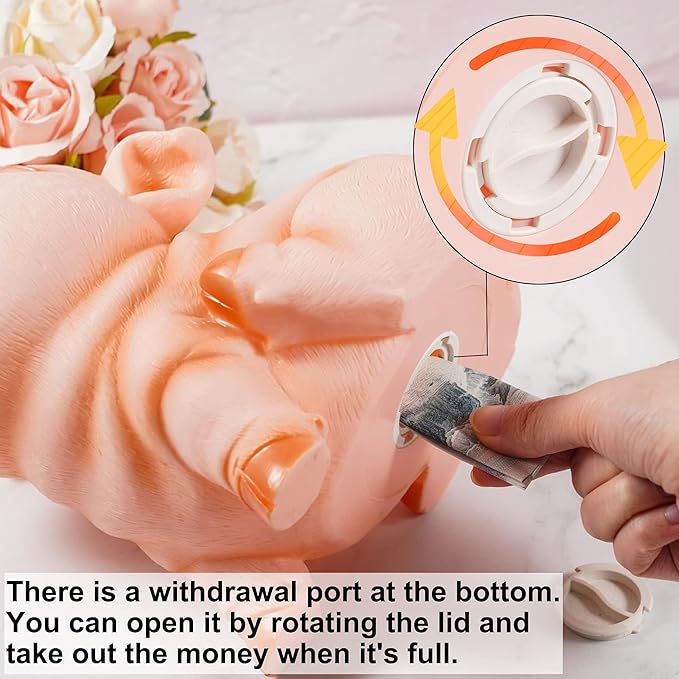 - COIN SLOT:With a concealed design, the entrance to the piggy bank is designed at the mouth of the pig, which protect the beauty of the overall shape of the piggy bank.To accommodate more large coins, commemorative coins and notes. We opened the slot to 1.6inch, arguably the longest of its kind, ensuring that coins or notes of any size could be dropped without compromising aesthetics or usability