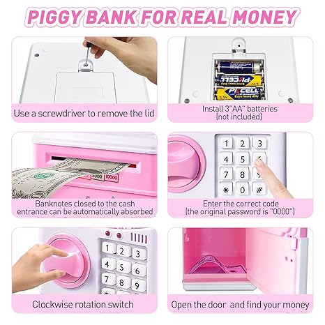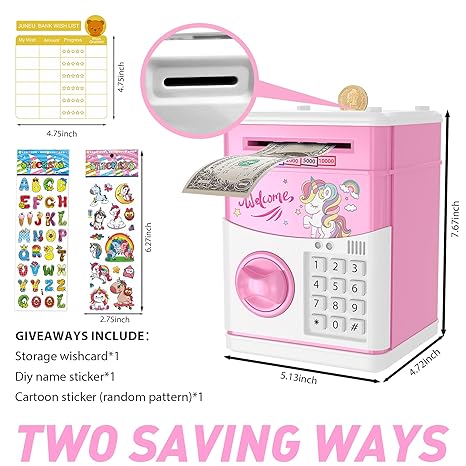 - 【Automatic Money Roll】- The paper money is put into the money box, the induction device is triggered and the cash money will be automatically involved. There is a coin slot on the top of the piggy bank to put coins to save money.